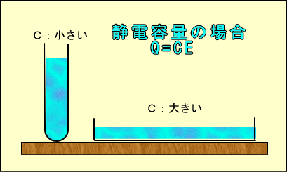 上の図にある「Q」はクーロンと言う電荷(電気のつぶつぶ)の量を表わし、同量の電荷ならば、静電容量「C」の違いによる両端電圧は、下図に示す水位のように変化します。