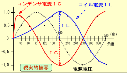 ※この図形には若干ウソがあります。というのも横軸の時間ゼロの時点でまだ電圧が発生していないのにコンデンサーにはプラスの、コイルにはマイナスの電流が描いてあるからで、実際のスタート地点付近は下の図のようになります。