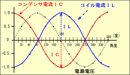 赤の線と青の線の和はいつもゼロになり、電流が流れていないように見える。