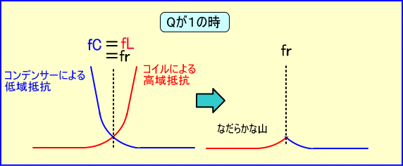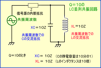 上の図で(Q=5)とありますが、LやCの値を決める時「Q」という値がものを言い、共振の鋭さを決定します。基準はQ=1の時で、共振周波数における信号源のインピーダンスと、L,Cのリアクタンスが同じ時です。