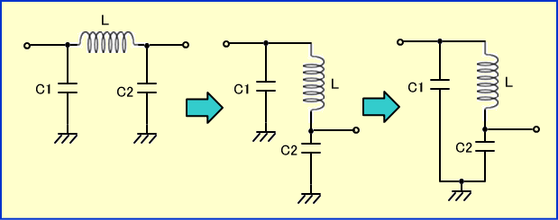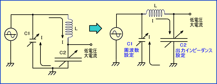 πマッチ回路を細かく見ると、2個の直列コンデンサとLによる共振回路であると同時に、共通の電流「I」をC1とC2がそれぞれ別の形で受け止める、コンデンサによる変換回路といえることもわかります。