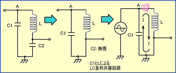 ということからC1が十分な容量性交流抵抗(容量リアクタンス:XC)を持つ周波数では、C2はほぼ無視できると考えると、この回路は単純なLC並列共振回路として見ることができます。