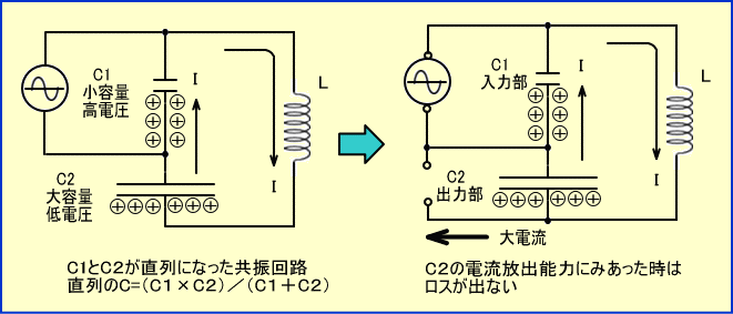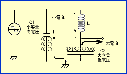もちろんC2に共振周波数の低電圧を入力すれば、共振回路には共通の電流「I」、すなわち単位時間あたり同じ電荷が流れるわけですから、C1にはその電荷に見合ったC2より高い電圧が発生します。