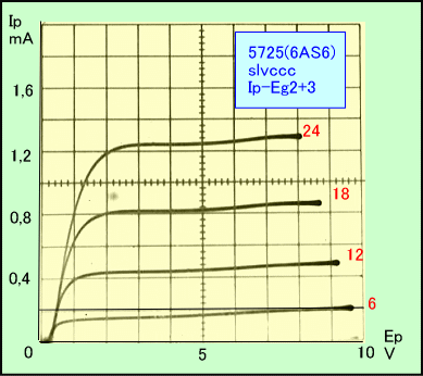今回のSLVCCCには5725(6AS6)を予定していて、2球合計のカソード電流が0,6mAまでならば、プレート電圧3Vにおいて、かなりリニアな電流特性による動作が期待できます。