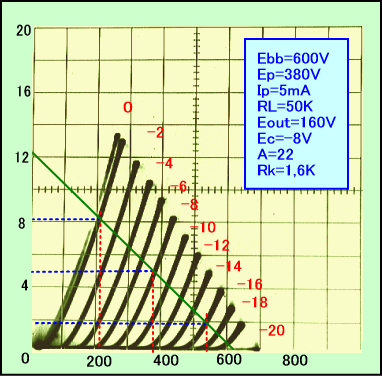 かつて計測しておいた6N7のカーブを用いてロードラインを引いてみると、出力電圧レベルも含めうまいぐあいに予定通りとなりました。カソード抵抗は1,6kΩとなっていますが、実際は共通カソードなので800Ωとなります。