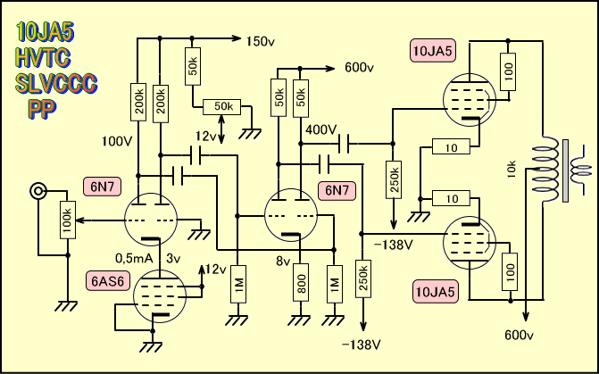 特別というのは、グラフからEb=150Vの動作例では約25倍のゲインとなるため、これを差動増幅で使うと約8倍程度になります。そこでもう1段6N7によるEp=600Vの動作を行えば、ちょうど160〜190倍程度になるという事です。