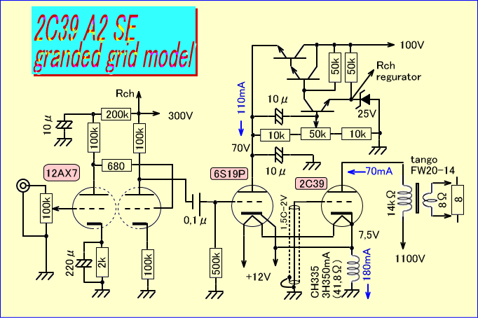 ヒーター電圧は2C39と6S19Pの直列でジャストに2分割はされず、2C39が0,5Vほど低めですが問題ありません。また歪率からの最適動作点として、6S19Pには140mAアイドリングを流しています。