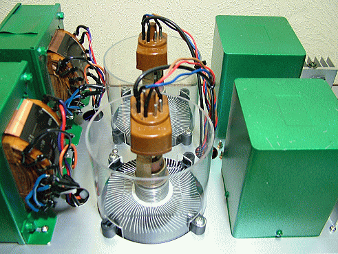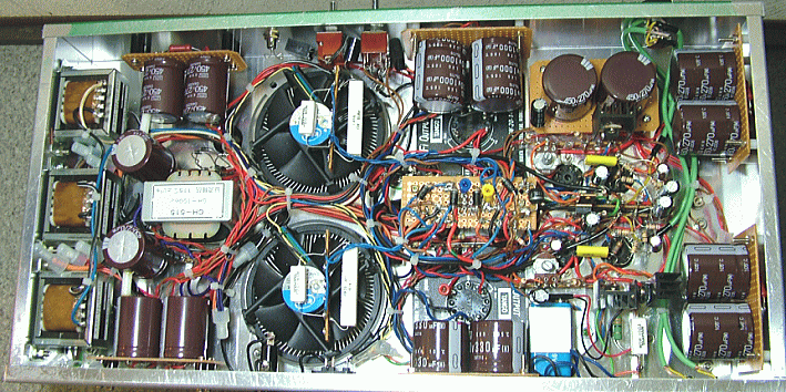 内部はほとんんどが出力段用高圧1100V、初段用中圧300V、ドライバー用低圧100V(→定電圧70V)、ヒーター用12V、冷却バックアップ用9V、といった電源関係と冷却ファンで埋め尽くされています。