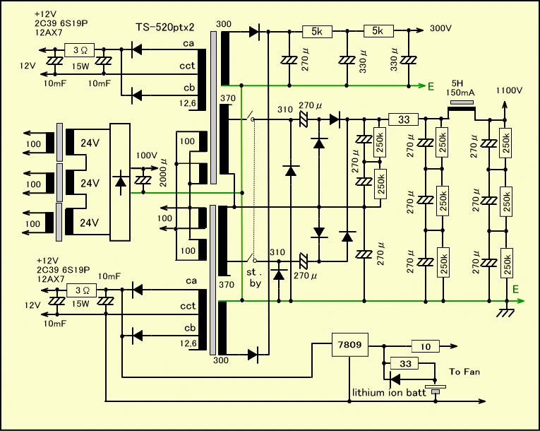 低圧100V電源はスペースの都合で24V 0,3Aのトランスを3個直列で使い、シャーシの隅に納めました。このアンプは電源スイッチ投入後、2C39の規格表にあるように、1分以上待ってからスタンバイスイッチを入れます。