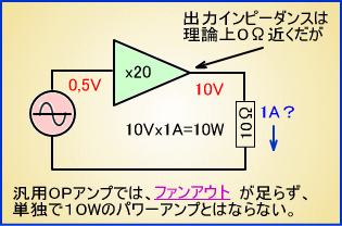 たとえば汎用型OPアンプの出力インピーダンスがいくら低いと言っても、10Ωの負荷に10V、つまり1Aも電流が流せないというのと同じ原理です。