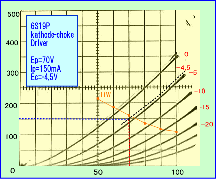 そこでドライバーのアイドリング電流をグリッド電流の3倍である150mA とすれば、内部抵抗が低くあまり大げさな球でない6S19Pで設計すると、プレート損失内ではEp=70V程度の動作となりました。