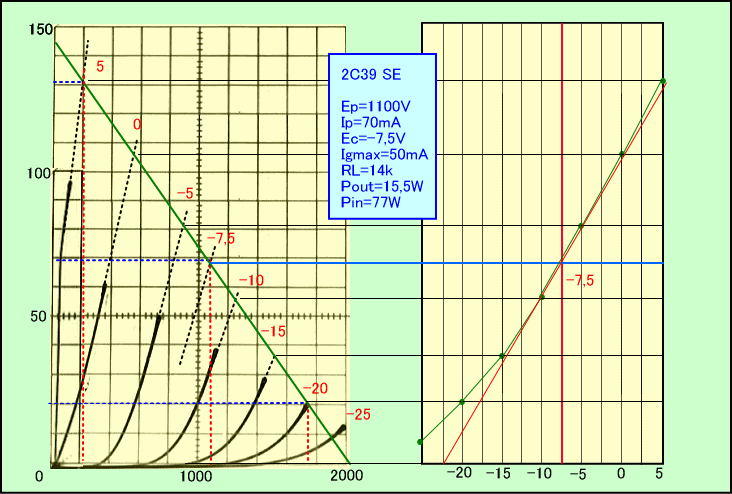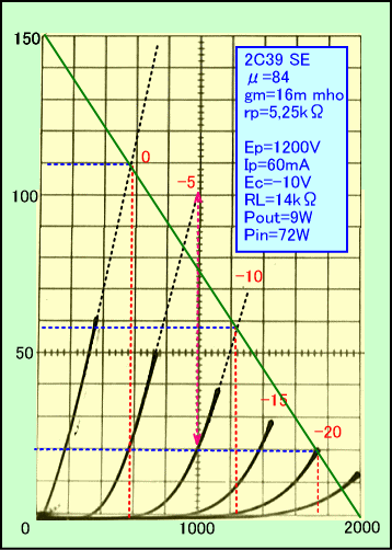 そこでA2級領域まで手を広げ、グリッドをプラス5Vまでスイングすることにすると、15W程度まで出力を増やすことが可能だと判りました。これでもプレート効率は20%です。