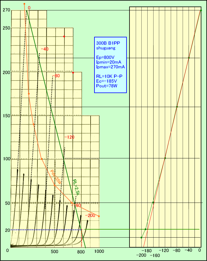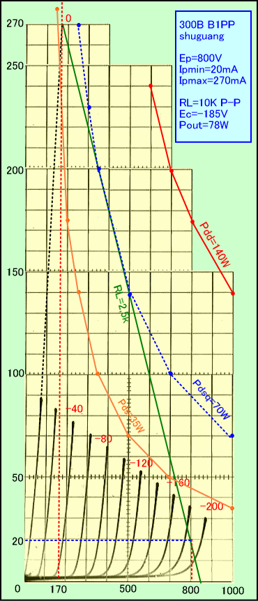 そこでプレート損失やフィラメント電圧以外は、300Bの扱い方について何も知らなかったことにして、特性カーブから勝手にアンプを設計してみました。動作はB