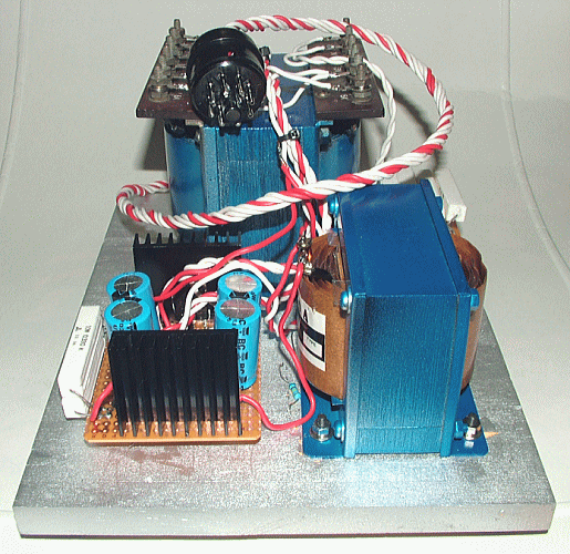 また出力トランスのコア部分は黒色でしたが、見た目が重すぎるため、シルバーに塗り替えてあります。電源トランスはオークションで手に入れた100V対635Vx2というもので、やはりブルーとシルバーに塗装しました。