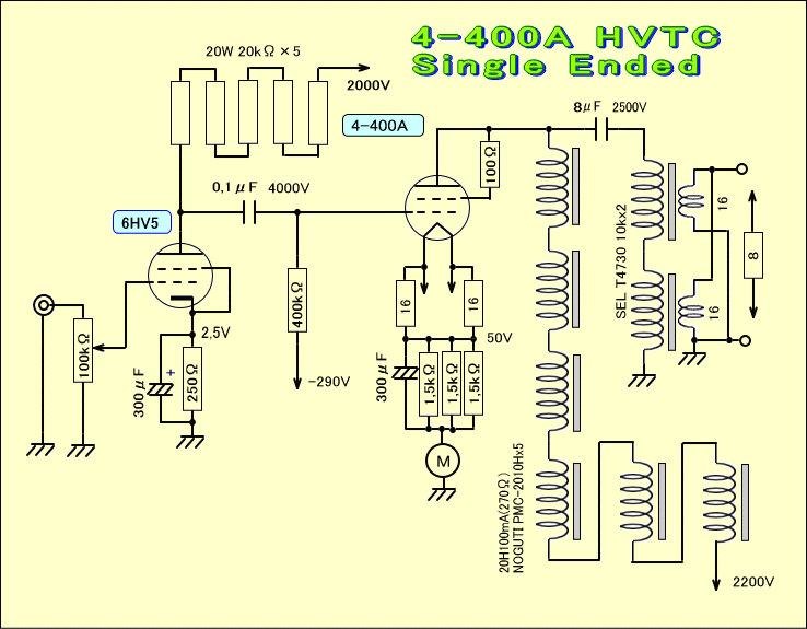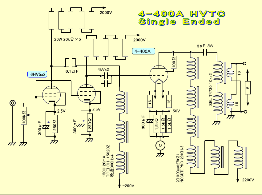 実際に変更した回路図をよーく眺めてみると、グリッドチョークを採用した割りにバイアス電源のインピーダンスをちゃんと考えていませんし、何か4−400Aと言う球をあまりに恐れ多く考えすぎて、不必要に大げさな回路になっている気がします。