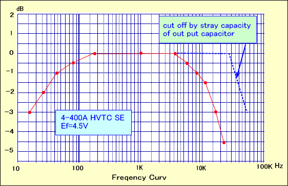今回使用したのは中国製4−400Aですが測定範囲外のカットオフ特性が予想特性よりも悪く、その反面6HV5Aドライバーの特性がとても良かったので、このような特性になりました。