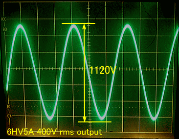 下の写真が400V rms時の波形で、ピーク値はプラスマイナスそれぞれ560Vまできれいにスイングできるとわかりました。この手の高電圧ドライブにおいて、6HV5は実にイイ仕事をしてくれます。