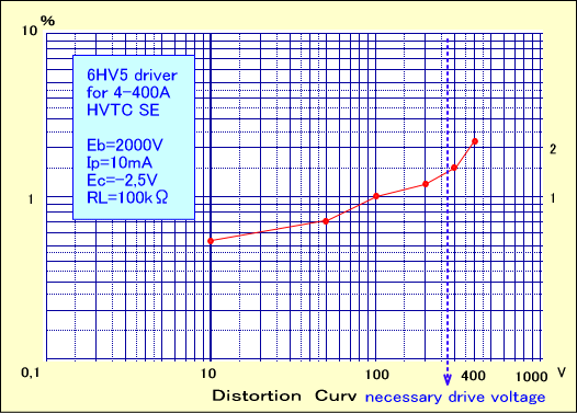 ドライバーに必要な出力電圧はピーク400Vでrmsなら290Vです。実際に歪率を計測してみると、300V rmsで1,6%、400V rmsでも2,2%と充分余裕があります。