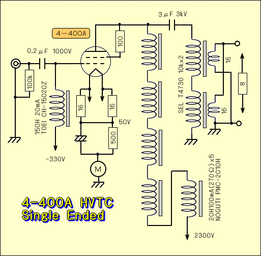 しかし4−400AによるHVTCではプレート損失400Wの低内部抵抗オーディオ出力管に変身するはずです。さらにこの球を2000V以上の3結で動作させること自体が、メーカーの保障外である「前代未聞の定格無視」という、ハイリスクなアンプ作りを意味する面白味を持ちます。