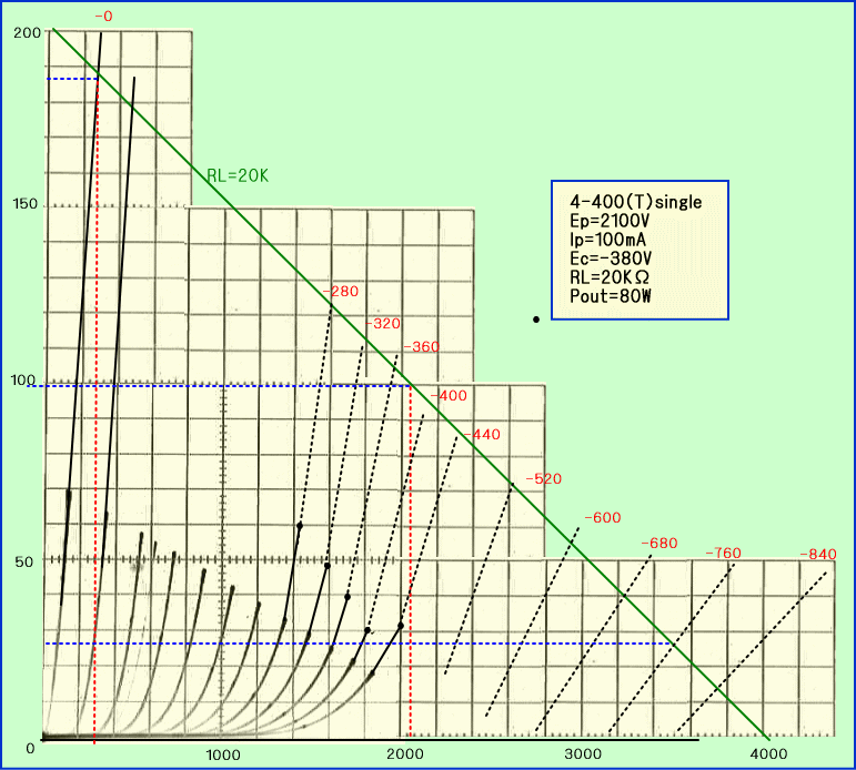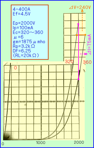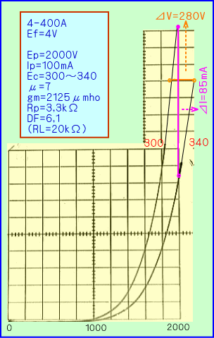 早速入手した4−400Aの3極管接続プレート曲線を測定し、バイアス電圧の最適値を見てみるとー、・・・・よ、よんひゃくボルトー!つまりドライブにはP−Pで800V必要なことになります。確かに(μ)が5でそれを2000Vまでスイングするのに400Vは必然でした。が・・・。