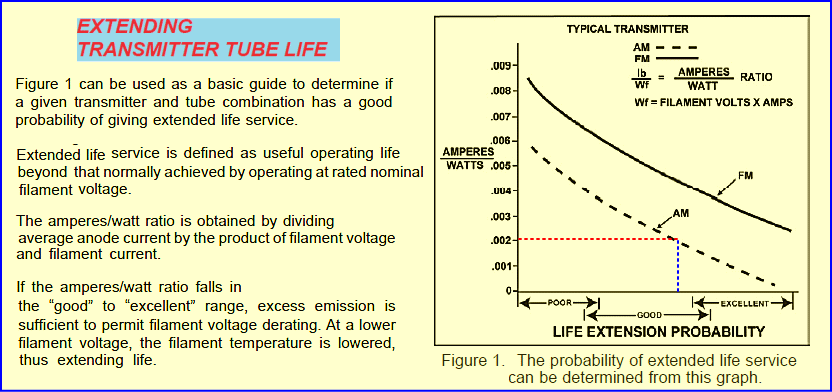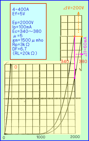 また別のグラフもあり、そこに載っている計算式に沿って計算すると、フィラメント電圧4V時、つまりヒーター電力50W時でプレート電流100mAの場合の縦軸値(レシオ)は0,002となります。