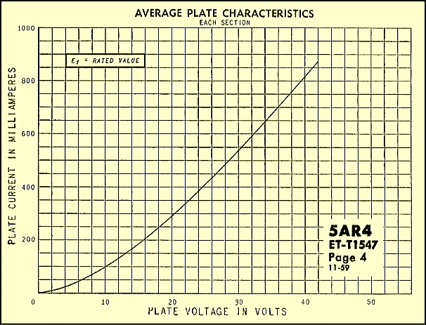 そこで参考までに同クラスの整流管、5AR4のIpt特性を載せてみました。これによるとEp=40Vで800mA超の電流が流れていて、6080の予測カーブが使えるとわかります。