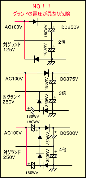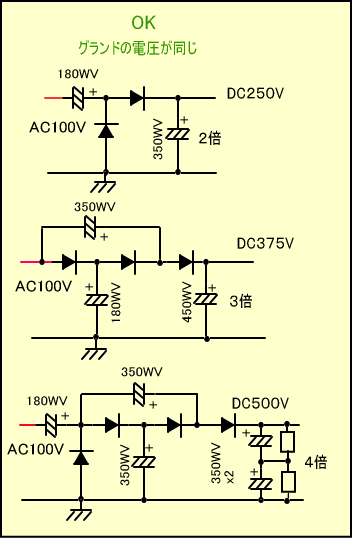 また電源トランスを共有する時は両波倍電圧を行うと、回路によって対グランドの電圧が変わってしまうので、片波倍電圧とします。同様にブリッジ整流もやめましょう。