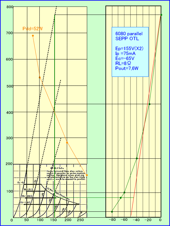 この場合Ep=155V Eg1=−63Vで7,6W出せ、クロスオーバー歪はだいぶ減りますます。ただし連続出力は1,6Wとなります。そこでさらにぐっと最大電流値を下げると