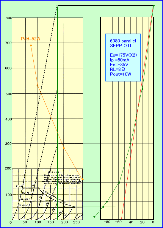 もう少し欲張るならEp=135V Eg1=−50V Ip0=80mAで4,5Wとなり、6080をもう2本加えて4パラとすれば9Wになるわけで、この辺が実用範囲という気がします。連続出力は約5Wでしょう。