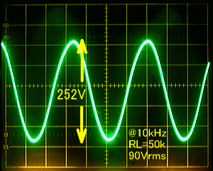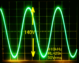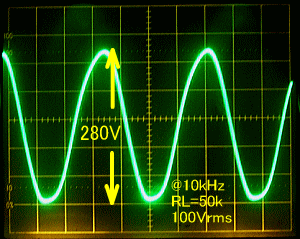 また下の写真がRL=25kΩ10KHz50Vrms、及びRL=50kΩ90Vrms、100Vrms出力時の正弦波形です。