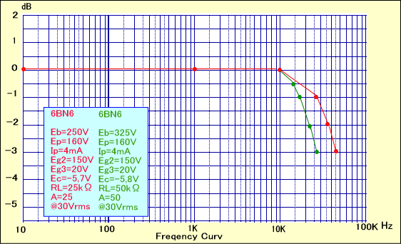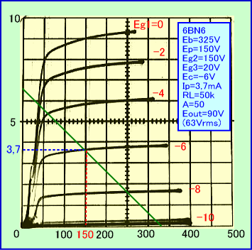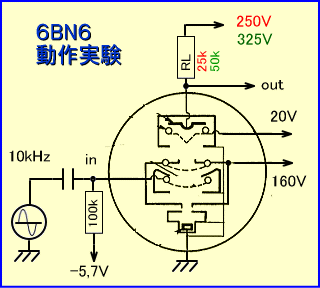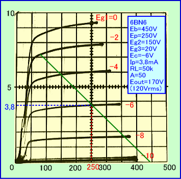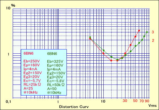 以上の実験から6BN6は、Eb=250V、RL=25kΩという低目の電源と負荷抵抗でも、大きな出力電圧を低歪率で出せる、電圧利用効率の高い球になるといえそうです。