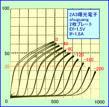 まずフィラメント電圧1,5V時のカーブですが、これは明らかにカソード(フィラメント)電力の不足による電流のリミッティング効果で、約35mAで起こっています。