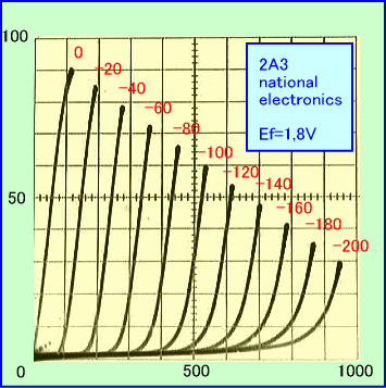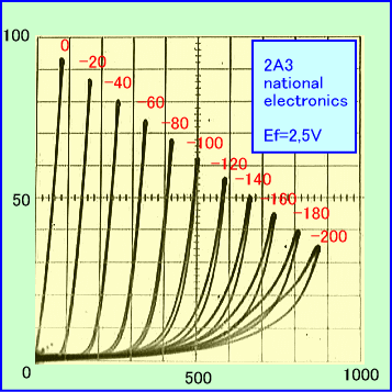 その後「NATIONAL ELECTRONICS」というブランド(中国製)の2A3が入手できたので計測したのが下のグラフです。本体細部の作りを見ると曙光電子と瓜2つですのでおそらく同じものだと思います。