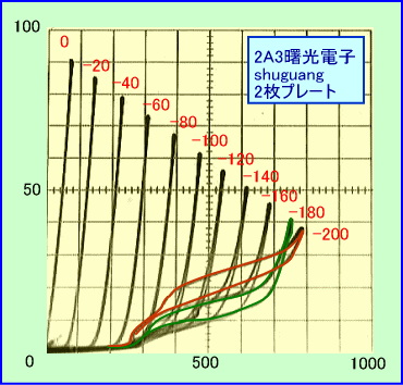 次に通常のフィラメント電圧で発生するヒステリシスカーブですが、グリッド電圧が−180V(緑)よりも−200V(赤)の時の方が早くプレート電流が立ち上がっています。