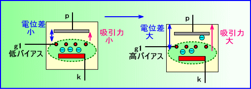 別の言い方をすると、グリッドから電子が飛び出すと同時に、それを補うようにカソードがグリッドに電子を与えるという連鎖反応が起こっていると考えられます。