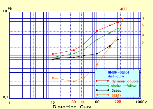 この条件で300Vrms出力時の歪率が最小になるようにすると、6EM7のプレート電圧が96Vので最適な状態となりました。