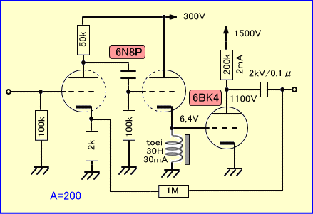こうすればいくらか出力インピーダンスが下がり、次段のグリッド抵抗も下げられます。しかし全体的に出力インピーダンスはまだ高目といえましょう。