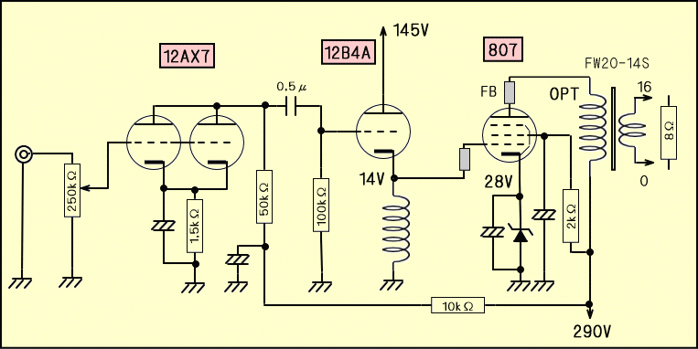 基本的に電圧増幅は12AX7パラレルで行い、12B4Aでインピーダンス変換します。807のプレートと第一グリッドにあるFBはフェライトビーズで、発振を防止しています。