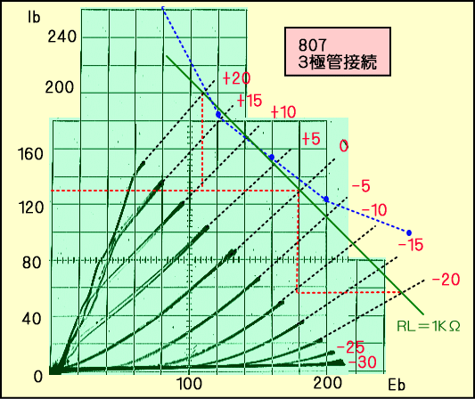 右が設計用の特性グラフです。青の点線がプレート損失25Wなので、プレート電圧を180V以下にすればグリッド電圧0Vでも、そこを越えないことが分かります。