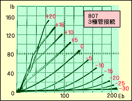 この3極管特性を見て感じること、それはグリッド電圧0ボルトのラインを中心として、等間隔でプラスマイナスに扇状のラインが広がっている点です。