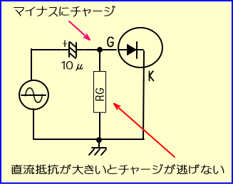 グリッドがプラスの時は、ダイオードが順方向なので、回路のインピーダンスも直流抵抗も低く問題ないのですが、グリッドがマイナスに振られた時、そのマイナス電圧が10μFのコンデンサをチャージして、マイナスの直流電圧が発生してしまいます。