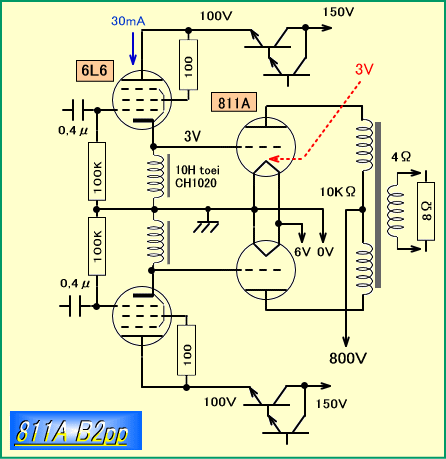 このままではゼロバイアスになっていないように見えますが、実は811Aのフィラメントは直流6Vの片側アースなので、フィラメント上の平均電位はプラス3Vとなり、ゼロバイアスが成立するわけです。
