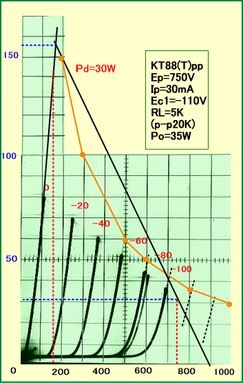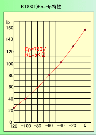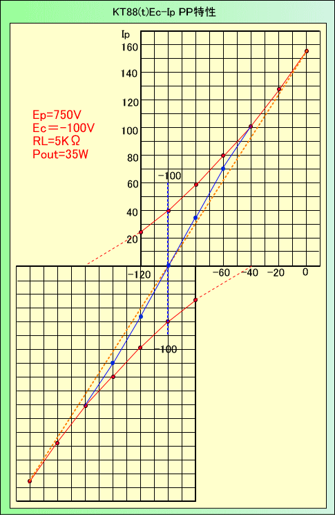 しかしながら例えばKT88(T)は下記ようにすばらしいリニアリティを持ち、HVTCシングルでも3%以下の歪で9Wを出せますが、PP動作ではカットオフ特性のため、クロス地点でわずかに歪が発生してしまいます。