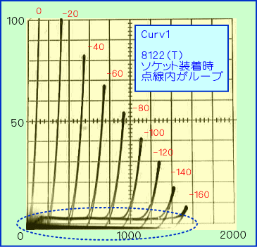 ということで早速計測してみると、波形に点線内のようなループ状の物が現れました。これはプレート電圧をゼロから所定電圧までスキャンする時、行きと帰りで電流の流れ方が違う事を表していますので、少し不安を覚えました。