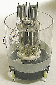 これにチムニーとして直径100mmx95mmのアクリルパイプを接着します。真空管を挿すと右のように頭でっかちが目立たなくなり、829B(写真はFU−29)の名に恥じないバランスのとれたデザインになります。
