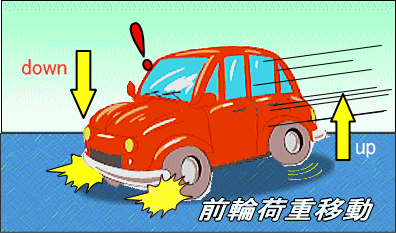 この状態は車重が前輪に強く掛かるように変化させたのと等しくなり、これを前輪への荷重移動とよびます。