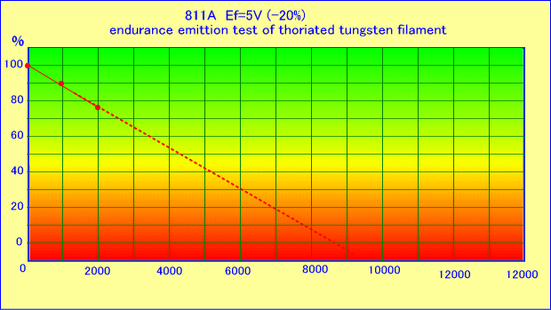 これによるとフィラメント電圧85%で動作させると、200時間しか持たないことになり、定格寿命の12,5%時点ではエミッションがガックリと低下しています。