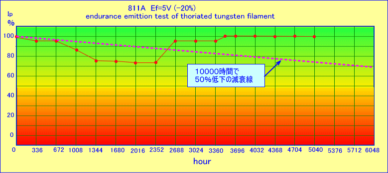 実際にはプレート電流の推移が直線的に減少するとは限りませんが、約1万時間という寿命が一応の目安となり、仮に50%を実用範囲とすれば、4000時間(毎日2時間動作で5,年半)が予想実用期間となります。