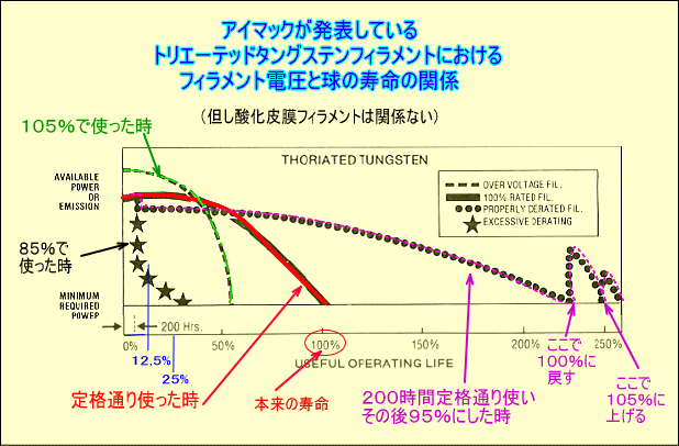 この程度ならば、フィラメント電圧を20%減少させた事による、急激なフィラメント性能の低下が起きているとは考えにくく、アイマックの2つ目のグラフにある、アンペア/ワットレシオにおける「エクセレント」という条件が利いているのかもしれません。