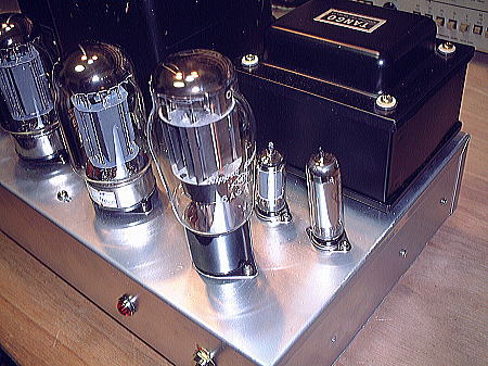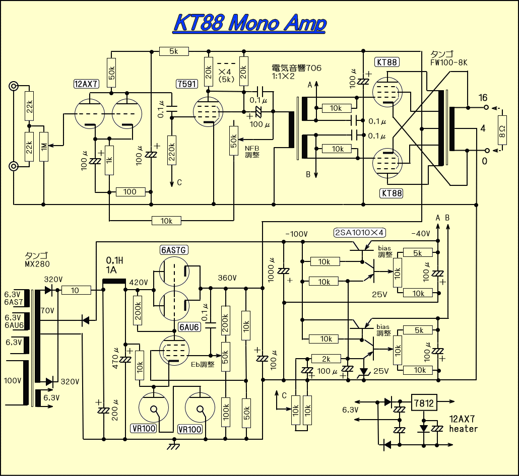 これがひさびさに作った、KT88ULモノラルパワーアンプの最初の回路図で、極めて常識的な回路といえます。電源は6AS7Gによる定電圧回路を採用した結果、ちょっと目には整流管で、しかも背後にある2本の放電管が美しい。